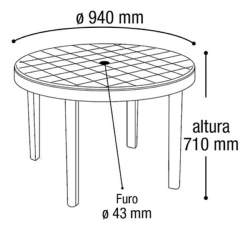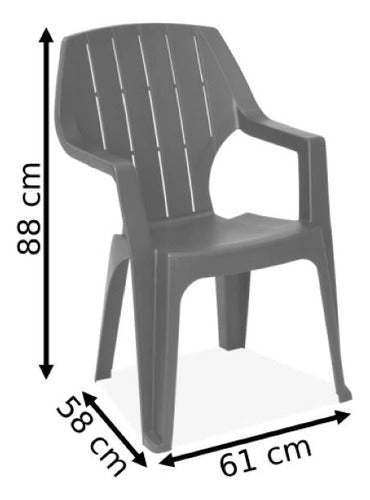 Práctico y cómodo juego de patio, jardín, balcón; compuesto por una mesa redonda de 94 cm. de diámetro y 2 sillas con posabrazos, modelo super reforzadas